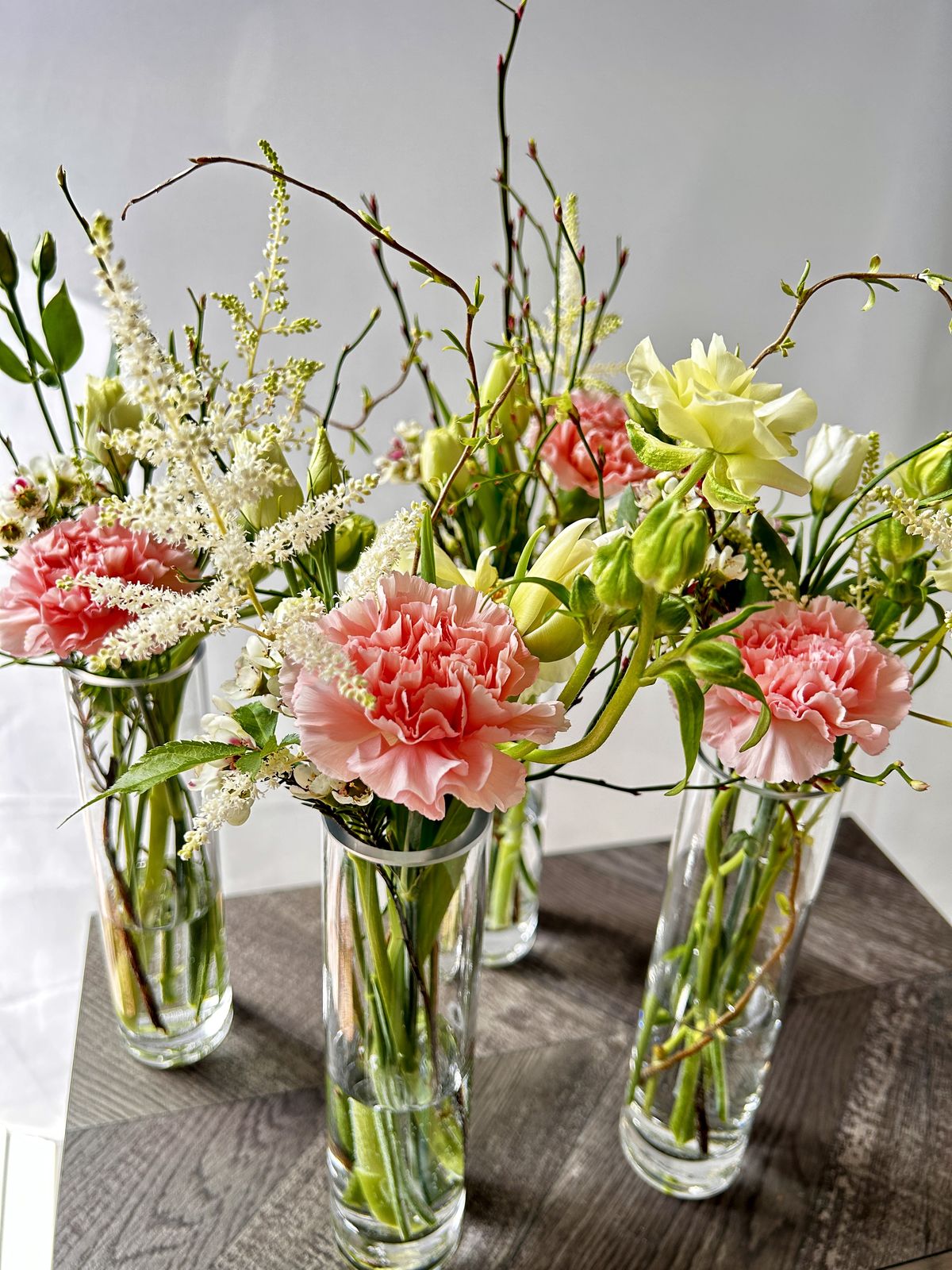 - Four bud vases placed on tables, featuring a mix of white, green, and a touch of pink flowers.