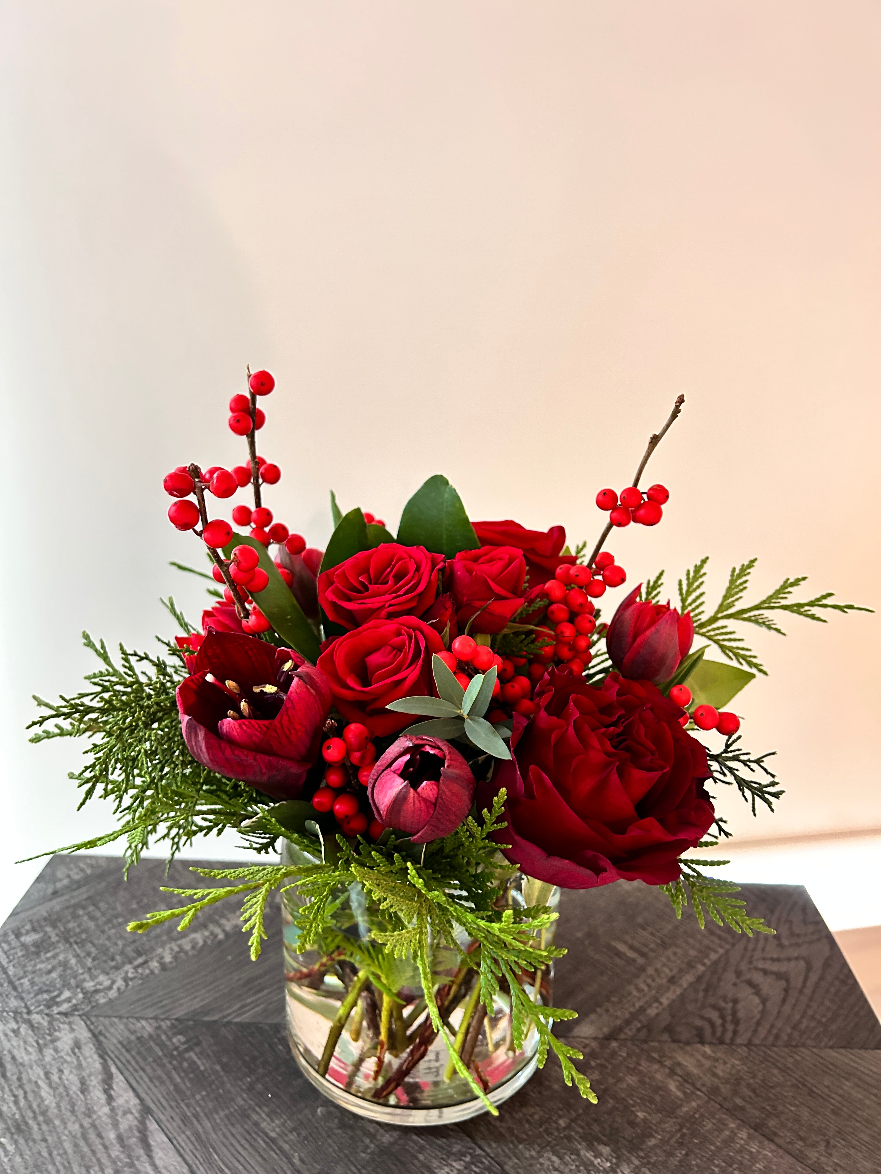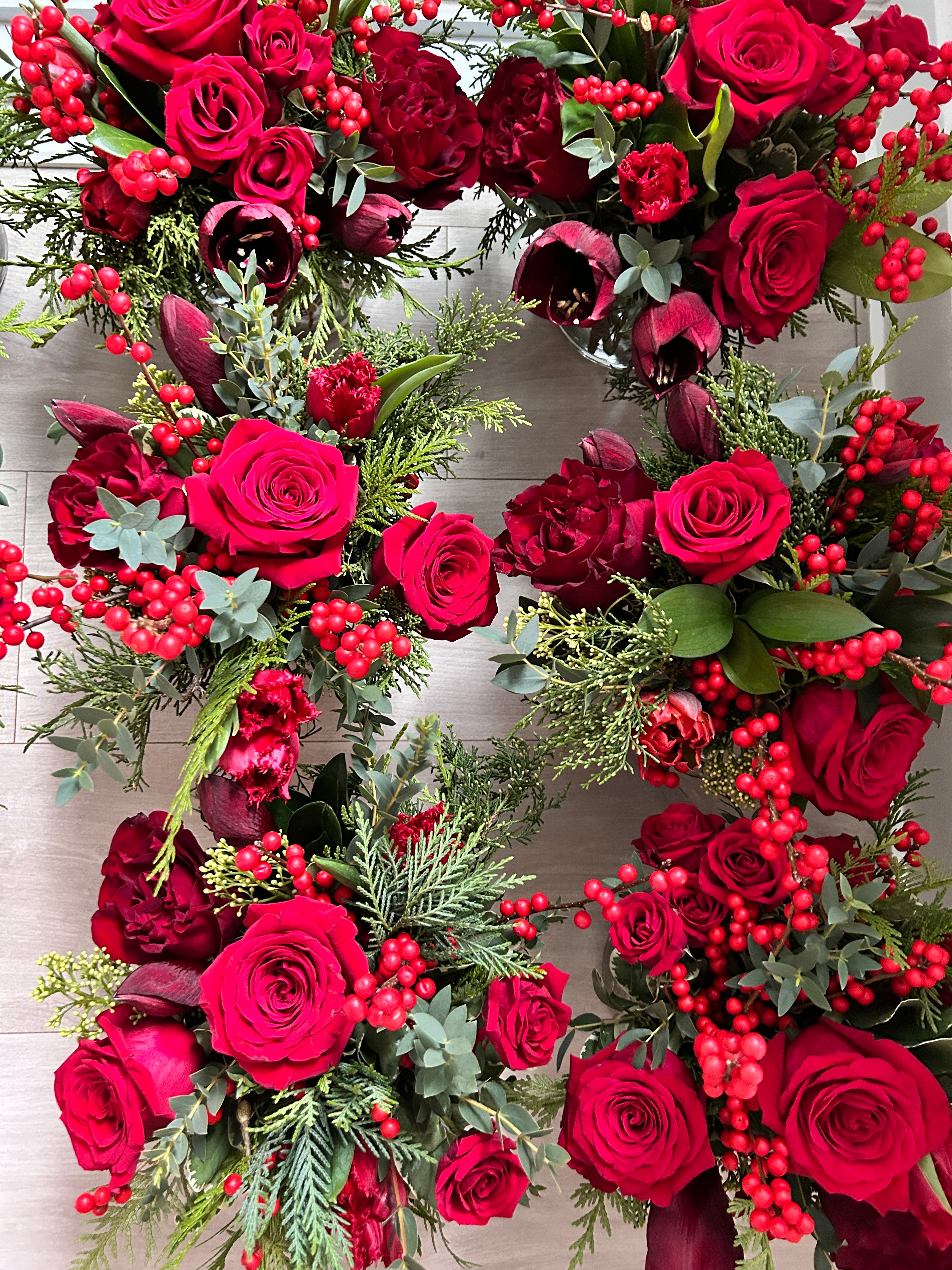 - Flowers: Red roses, burgundy amaryllis, red tulips, vibrant green seeded eucalyptus, delicate berries, holiday green cypress, and pine cones