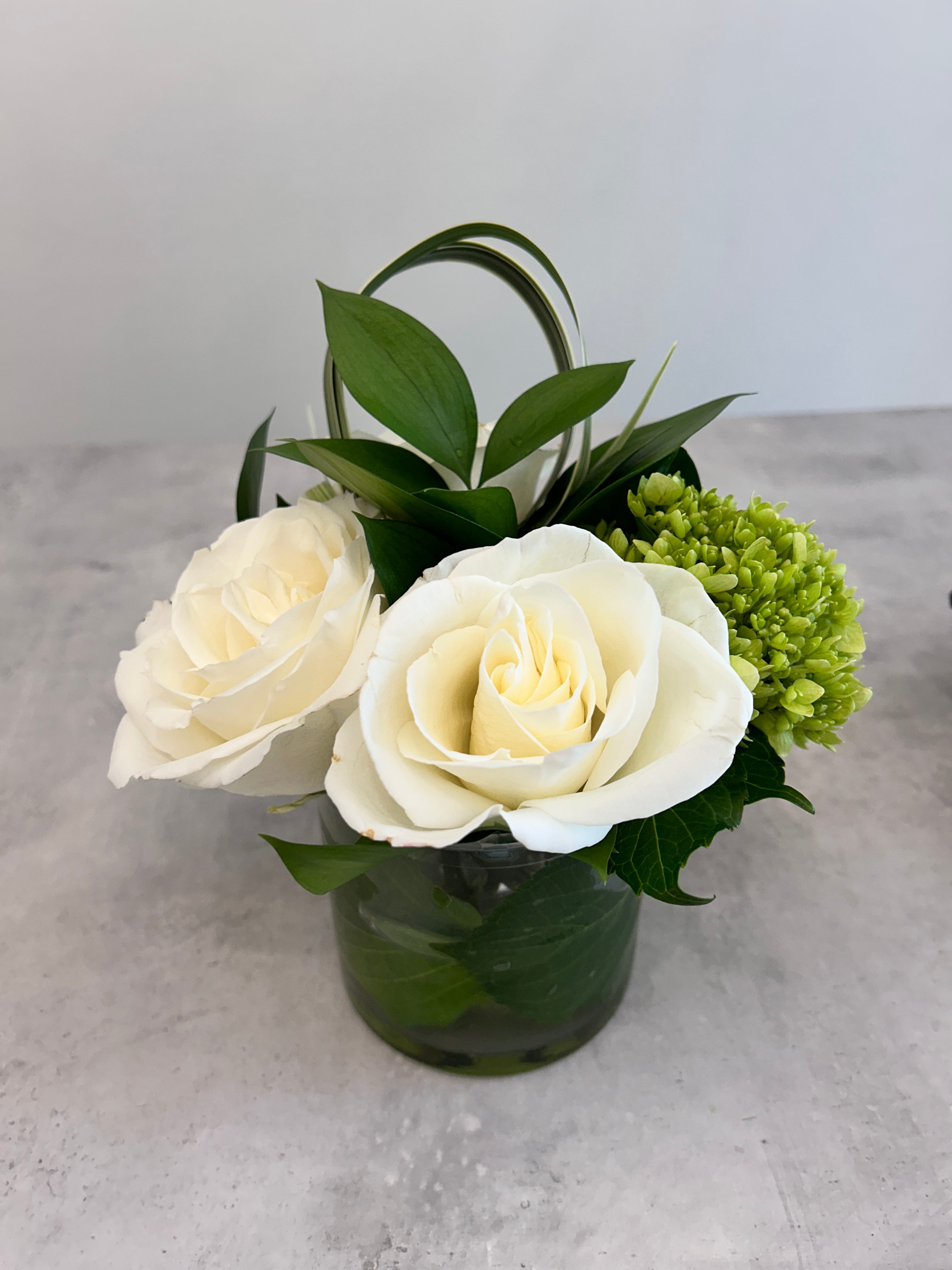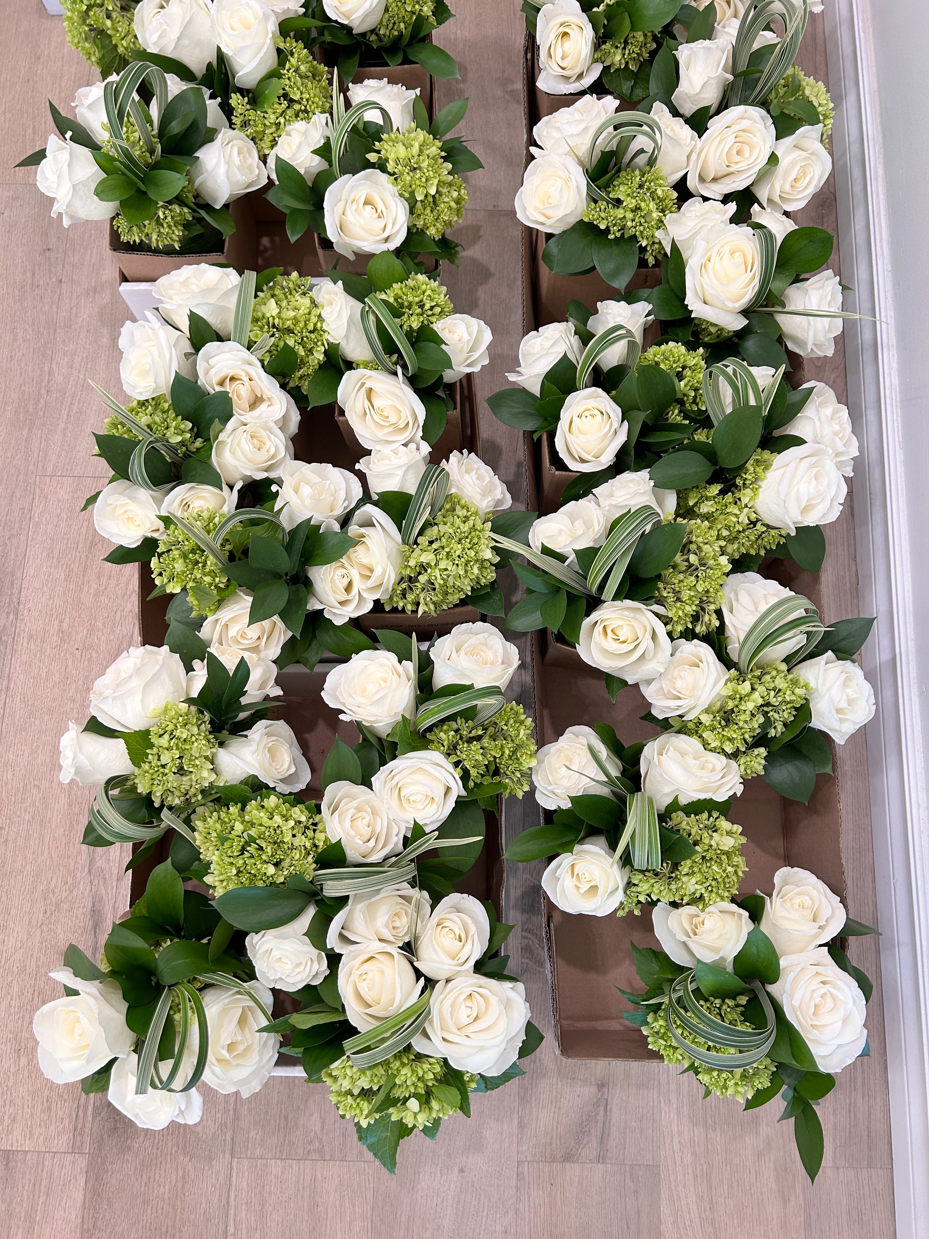 Flower Types: White roses, lime green hydrangea, bended grasses, optionally lime cymbidium orchids.