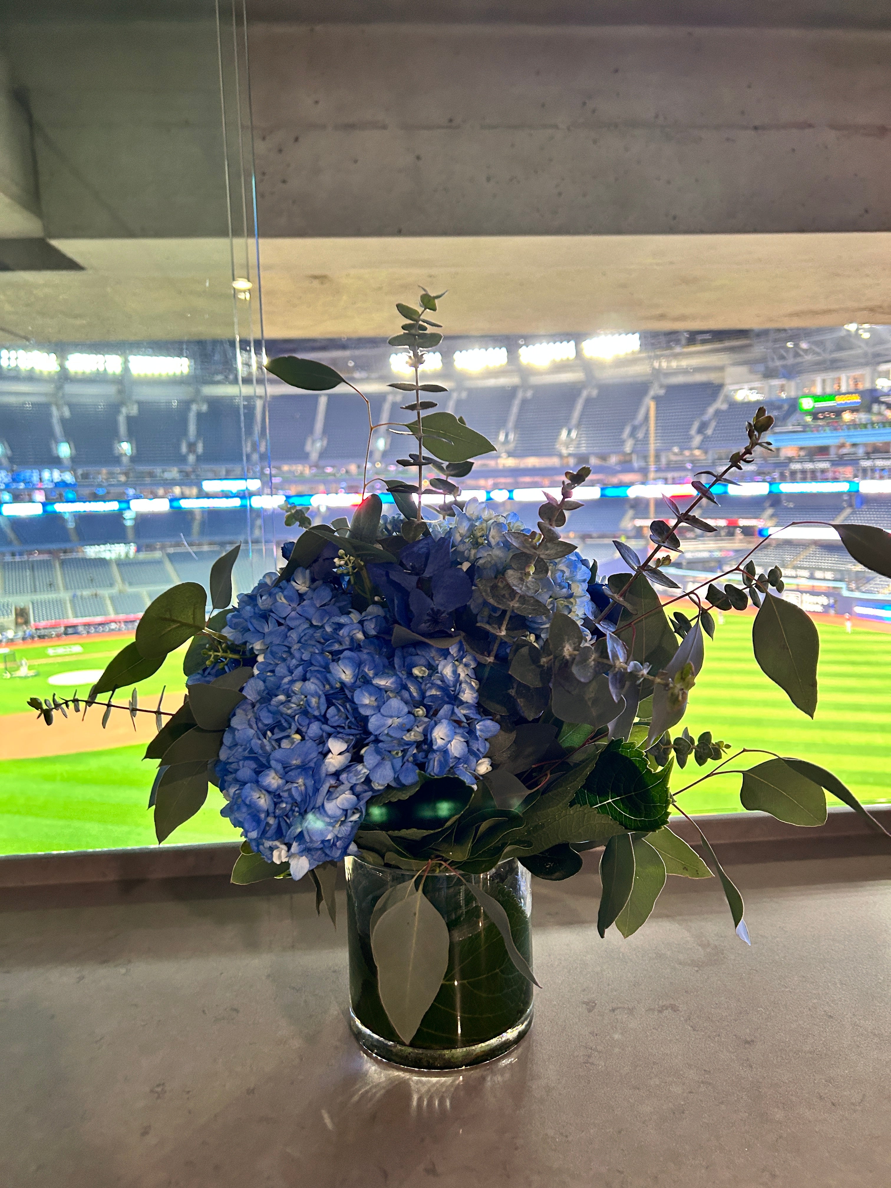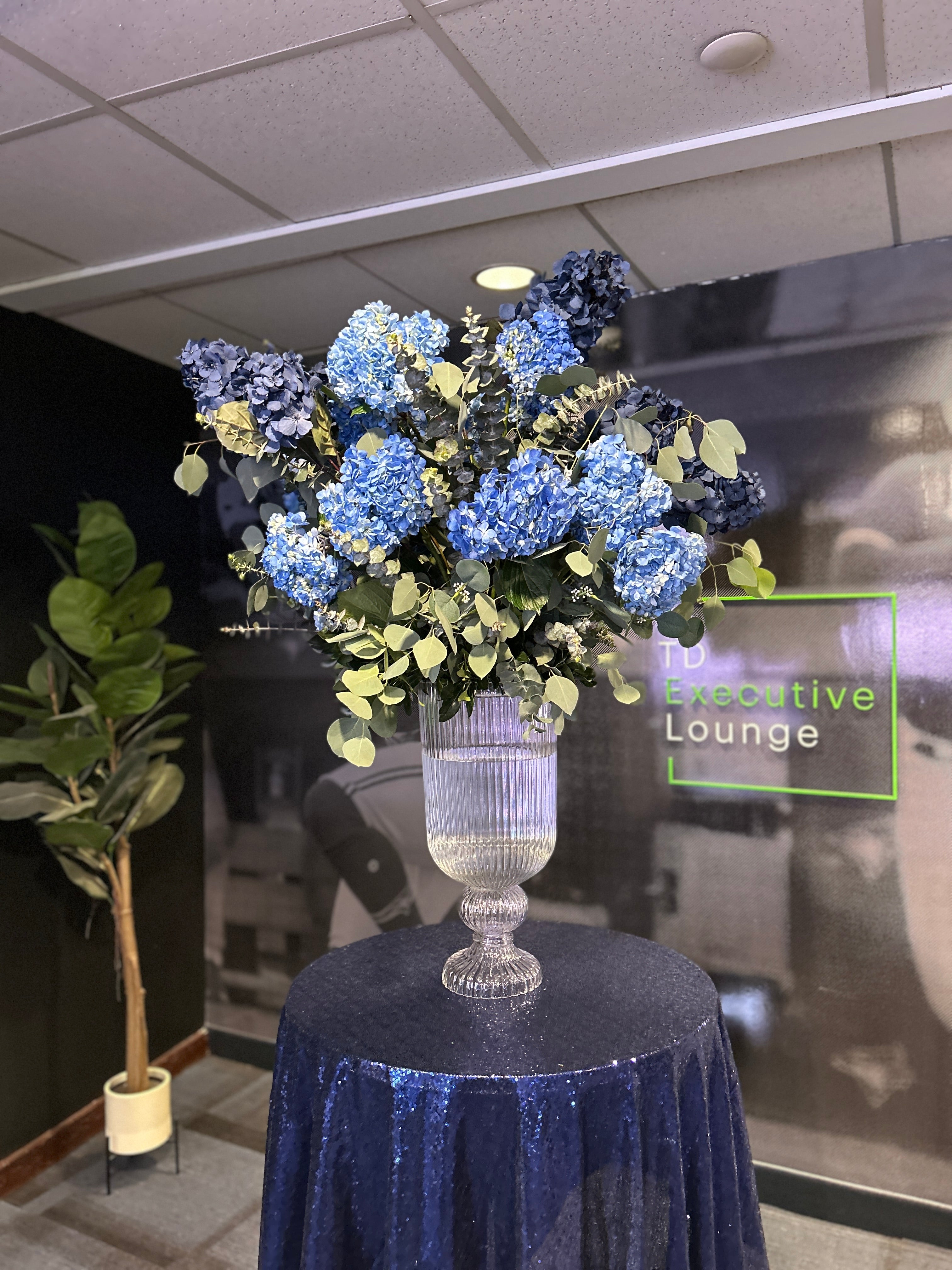- Description: A grand display featuring vibrant blue hydrangeas, interspersed with the textured elegance of blue dollar eucalyptus and silver eucalyptus. This centerpiece created a sophisticated focal point that commanded attention and set the tone for the event.