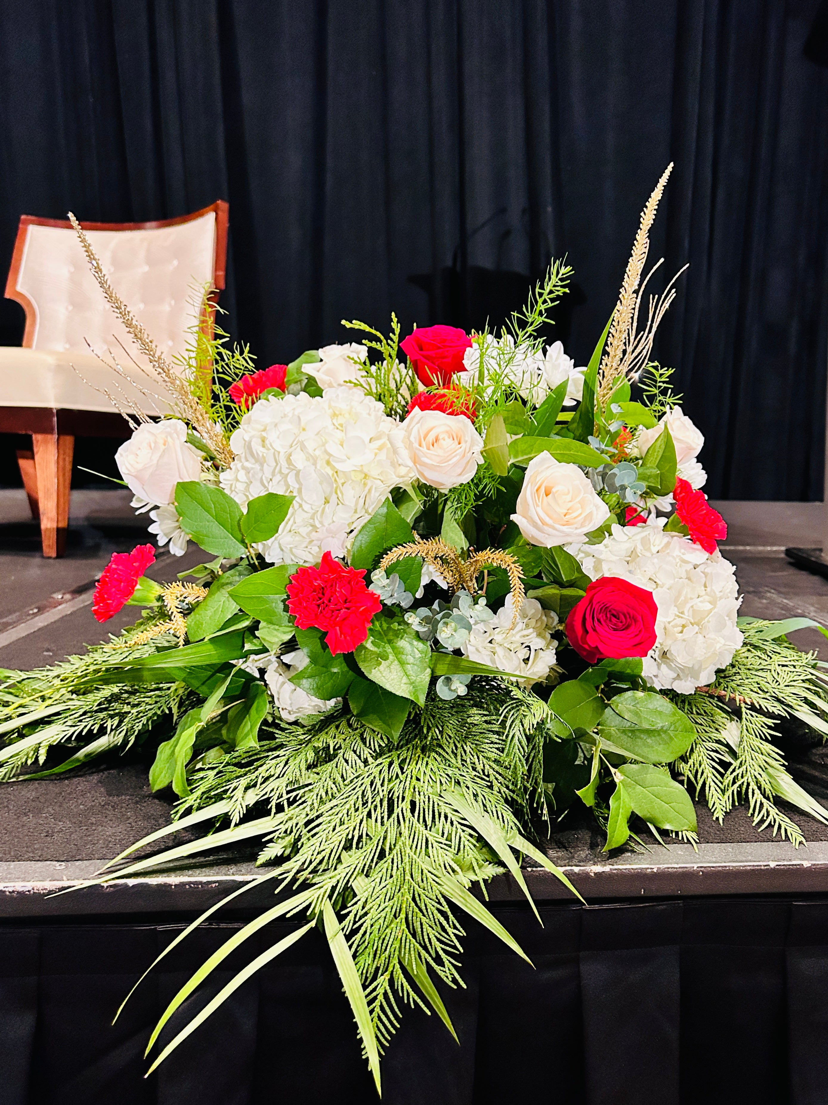 - Stage Arrangements: Two long high-level floral designs (22-24''L x 16-18'' W) for the stage, incorporating the event’s festive color palette and enhancing the overall decor.