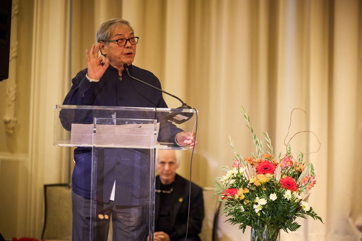 The floral installations were specifically designed to honor this significant martial arts milestone, with warm, celebratory colors that reflect the energy and tradition of 50 years of Tai Chi instruction. The arrangements flanked ceremonial banners in the elegant ballroom setting of the historic King Edward Hotel, creating a dignified atmosphere for speeches, demonstrations, and celebration.
