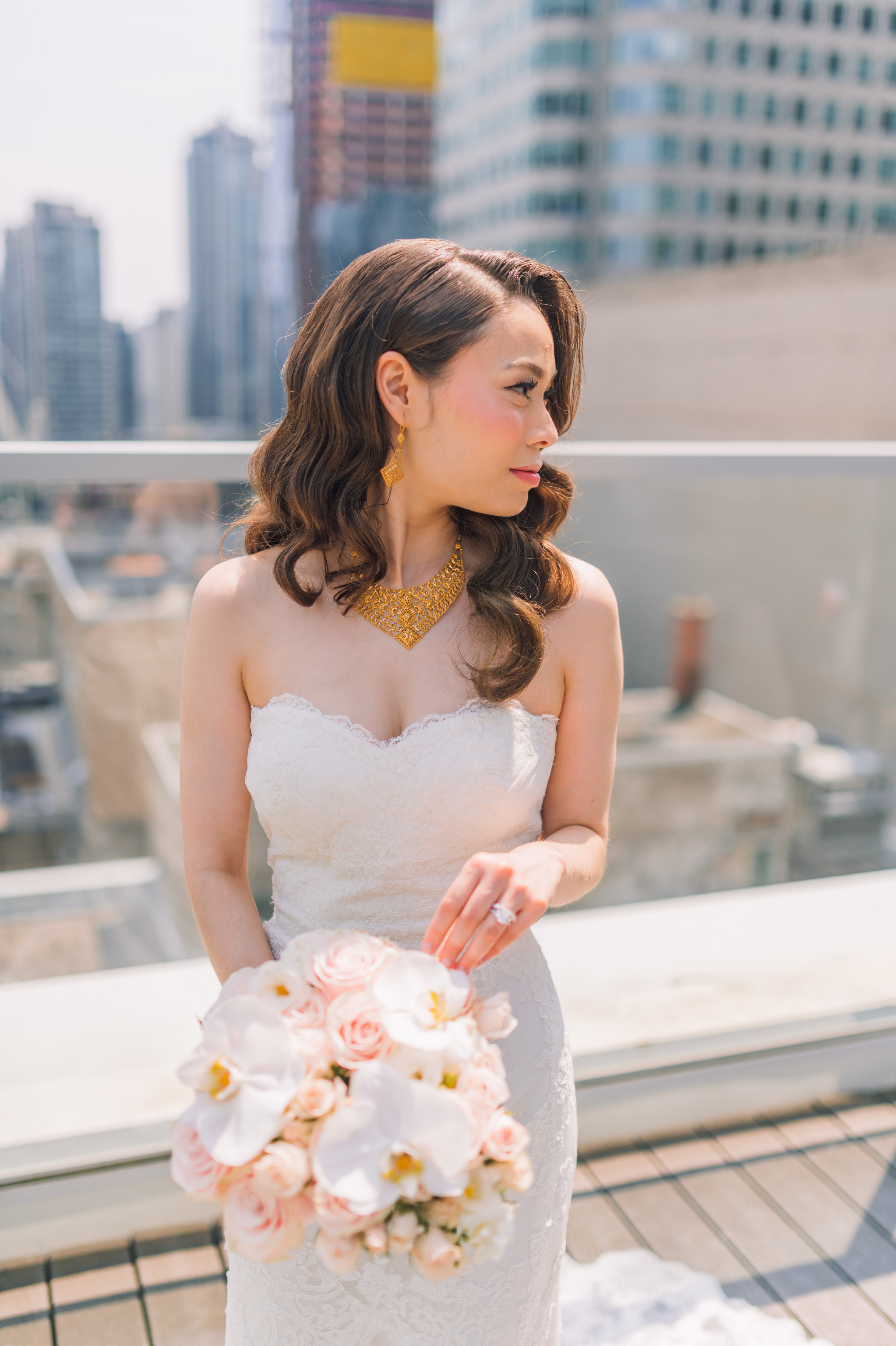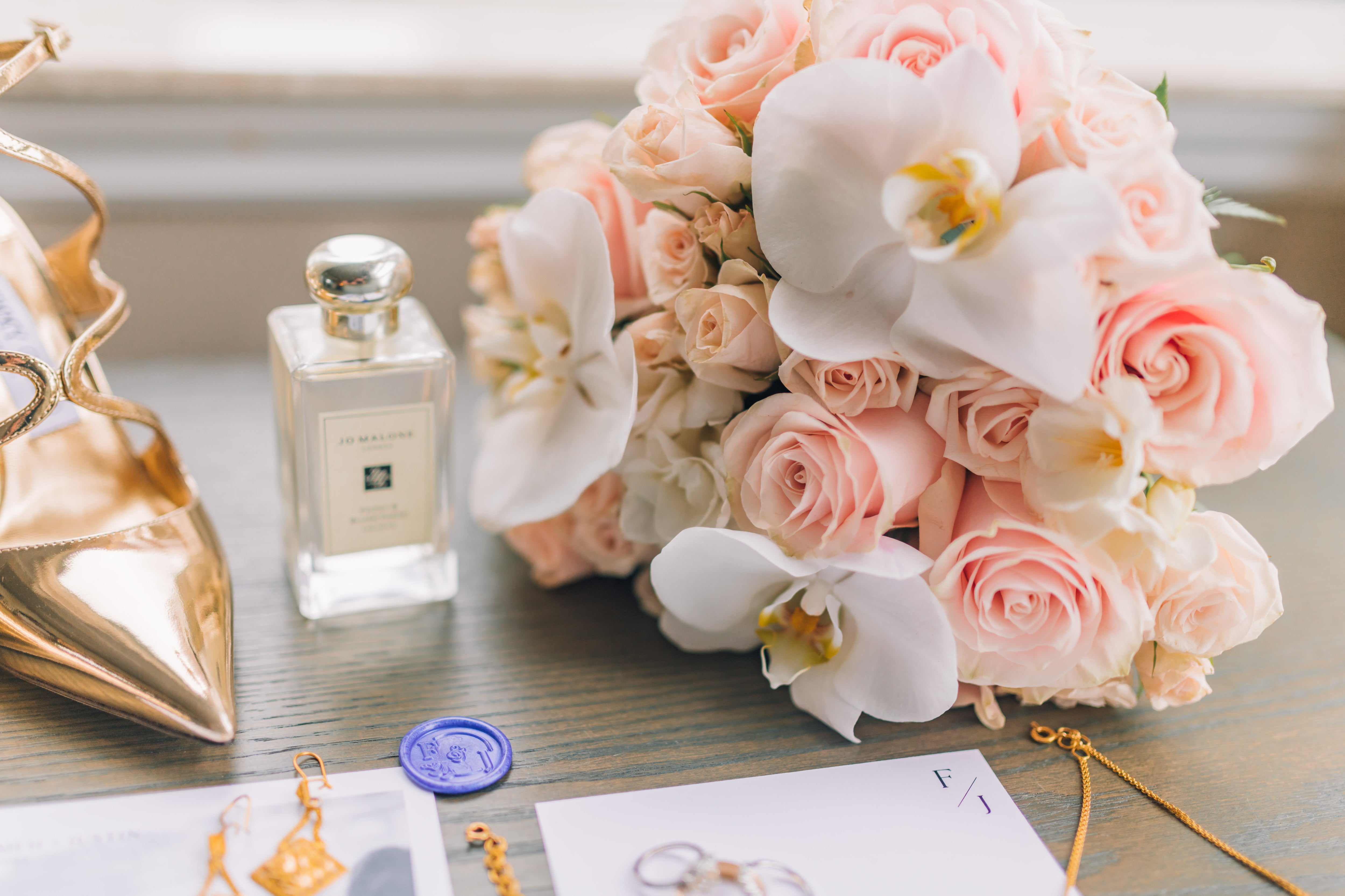 In the heart of Toronto, the elegant union of Fatemeh and Justin took place at One King Hotel. The couple's vision for their wedding day came to life through classic floral arrangements that spoke of timeless romance and beauty. The bridal bouquet was a breathtaking cascade of blush roses, spray roses, and white phalaenopsis orchids, creating a soft yet striking composition. Each flower was meticulously chosen to symbolize grace and sophistication, while the groom's boutonniere added a subtle touch of greenery, completing their harmonious floral theme.