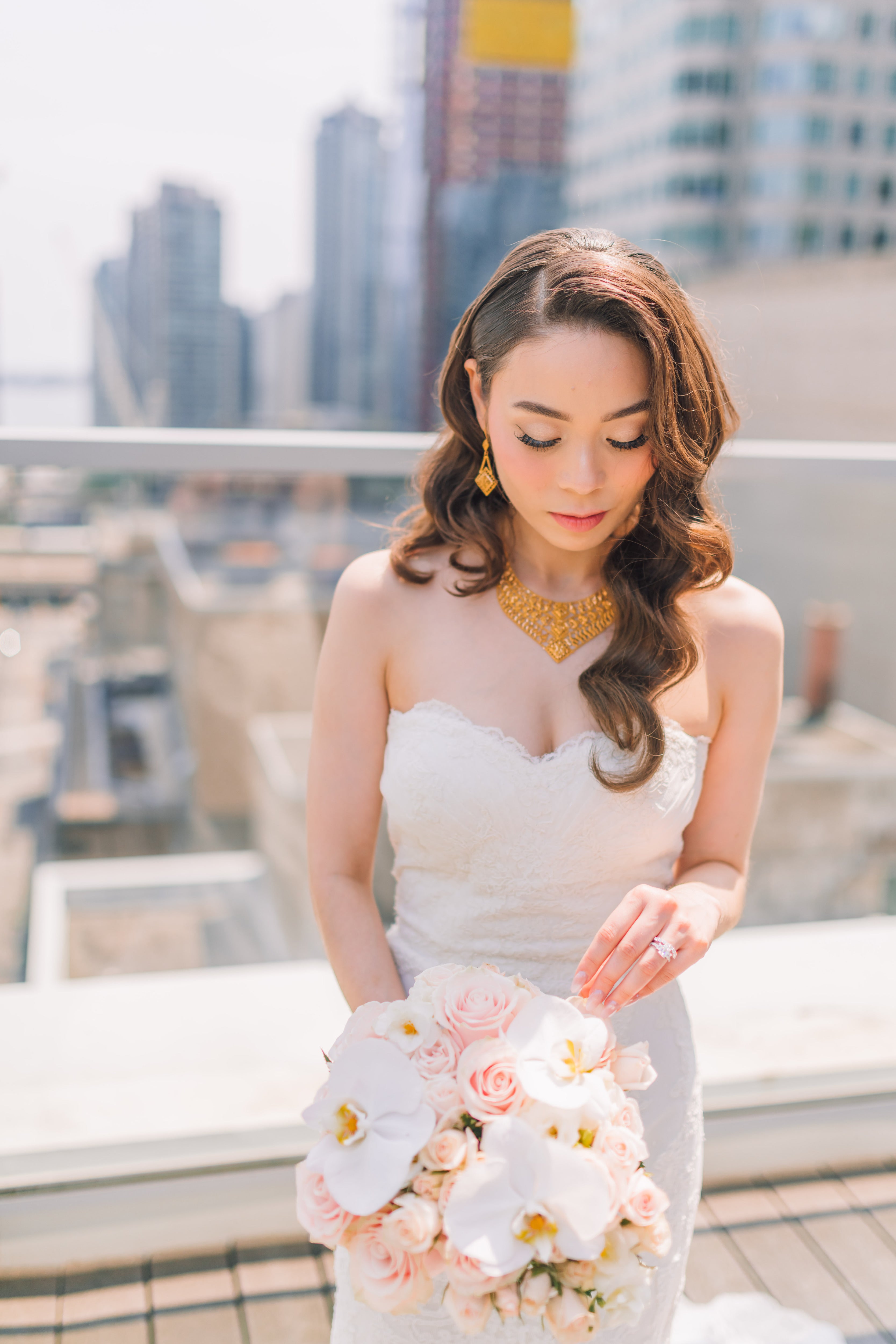 - Classic elegant bridal bouquet with blush and white blooms, adding an ethereal touch to the bride's ensemble.