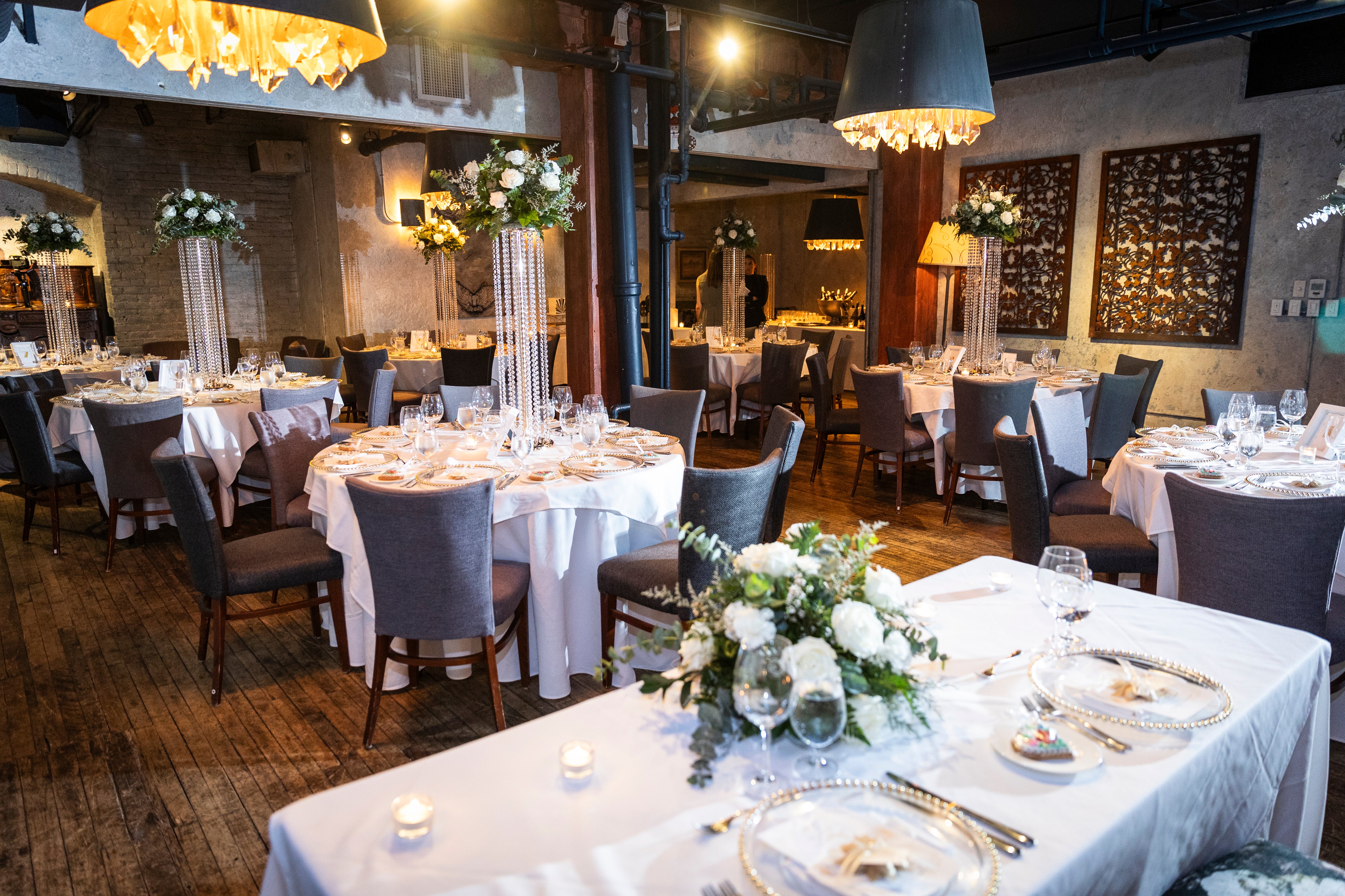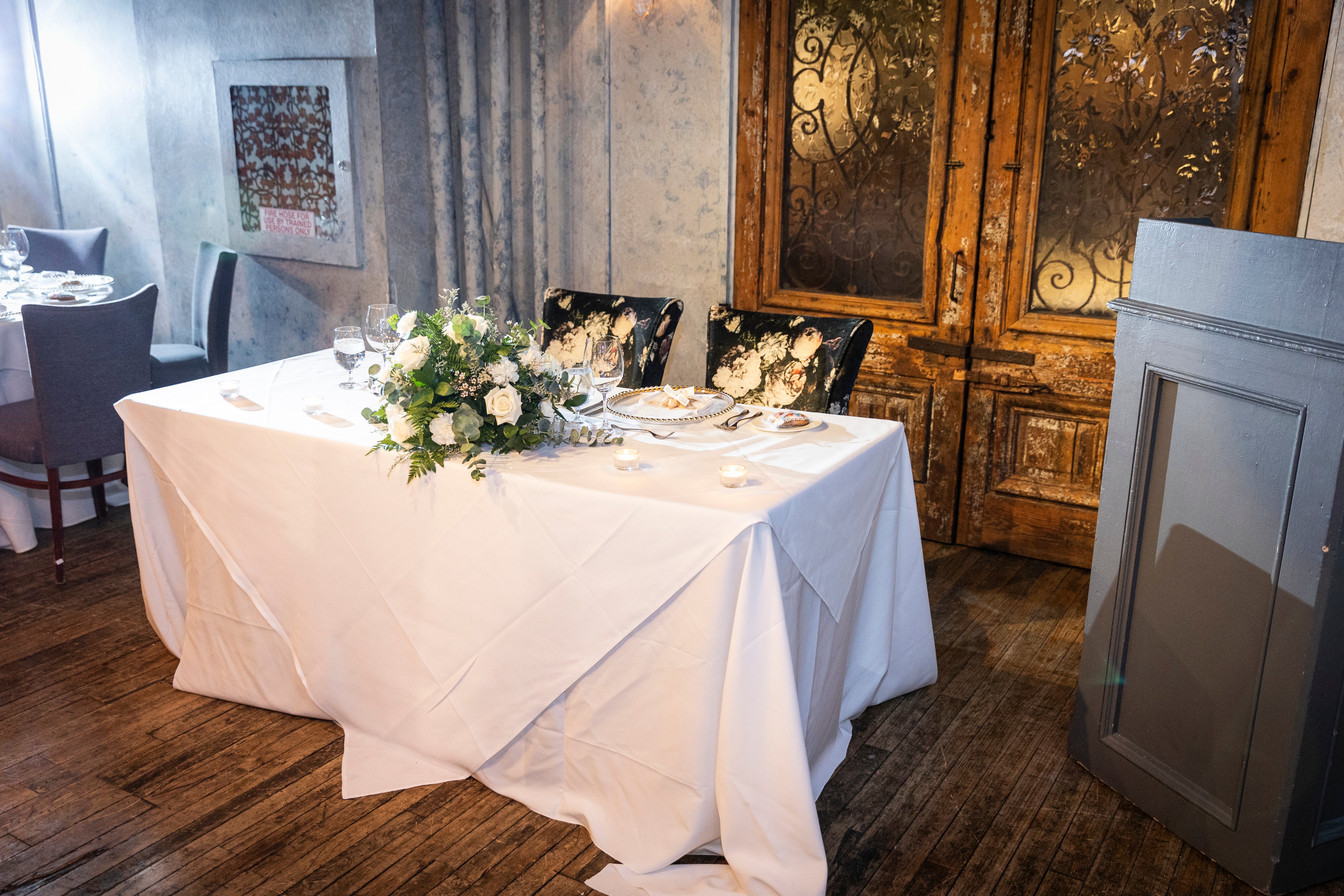 Andrea and her partner celebrated their wedding at the charming GEORGE Restaurant in Toronto. The florals were designed to bring classic elegance to the intimate and stylish venue. The bridal bouquet was a cascading arrangement that featured white roses, ranunculus, spray roses, and a vibrant pop of red anemone. The inclusion of fountain grass, Italian ruscus, and leather leaf created movement, while adding a lush texture to the arrangement.
