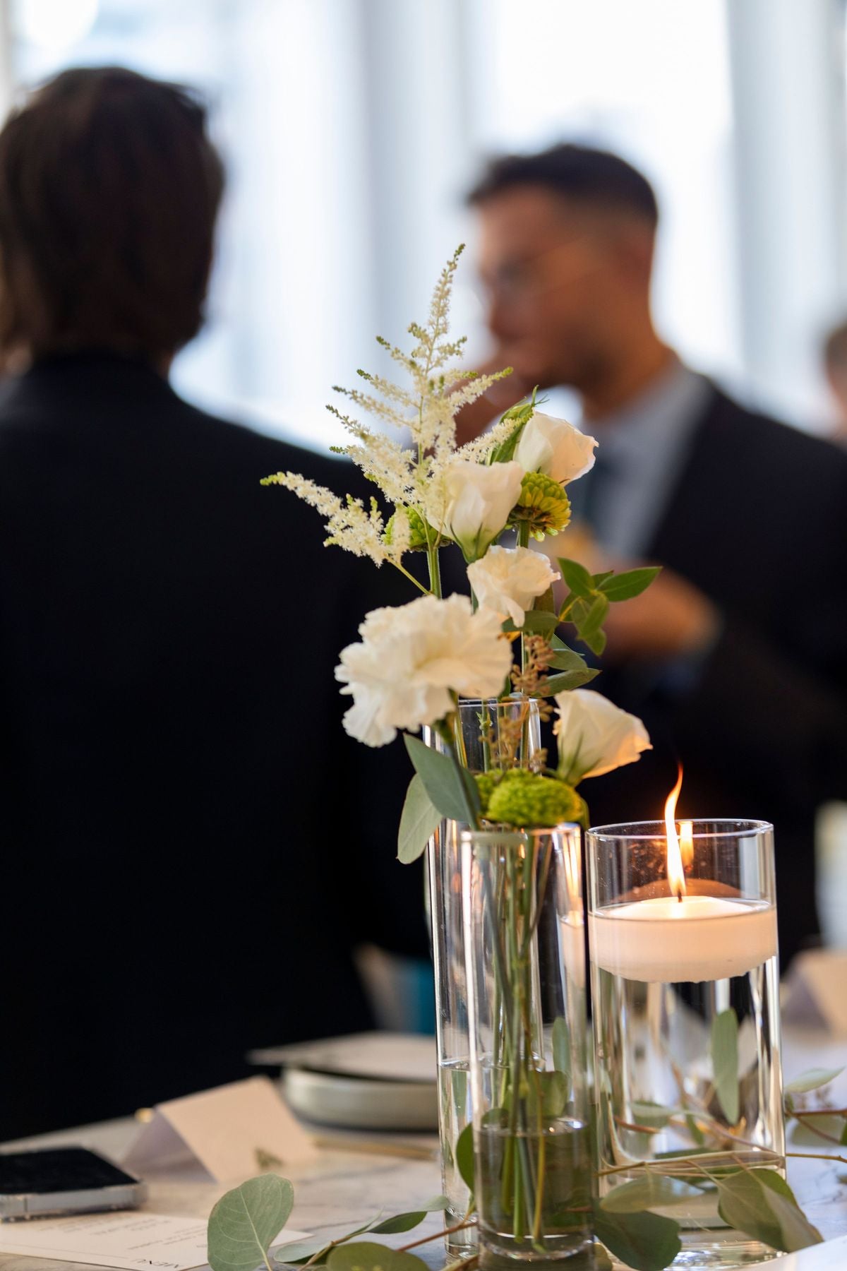 Reception Splendor: As guests transitioned to the reception, they were greeted by tables arrayed with centerpieces that whispered tales of delicate beauty. Ivory blossoms nestled among verdant foliage, while the soft dance of candlelight added a layer of warmth and intimacy to the celebration's fabric.