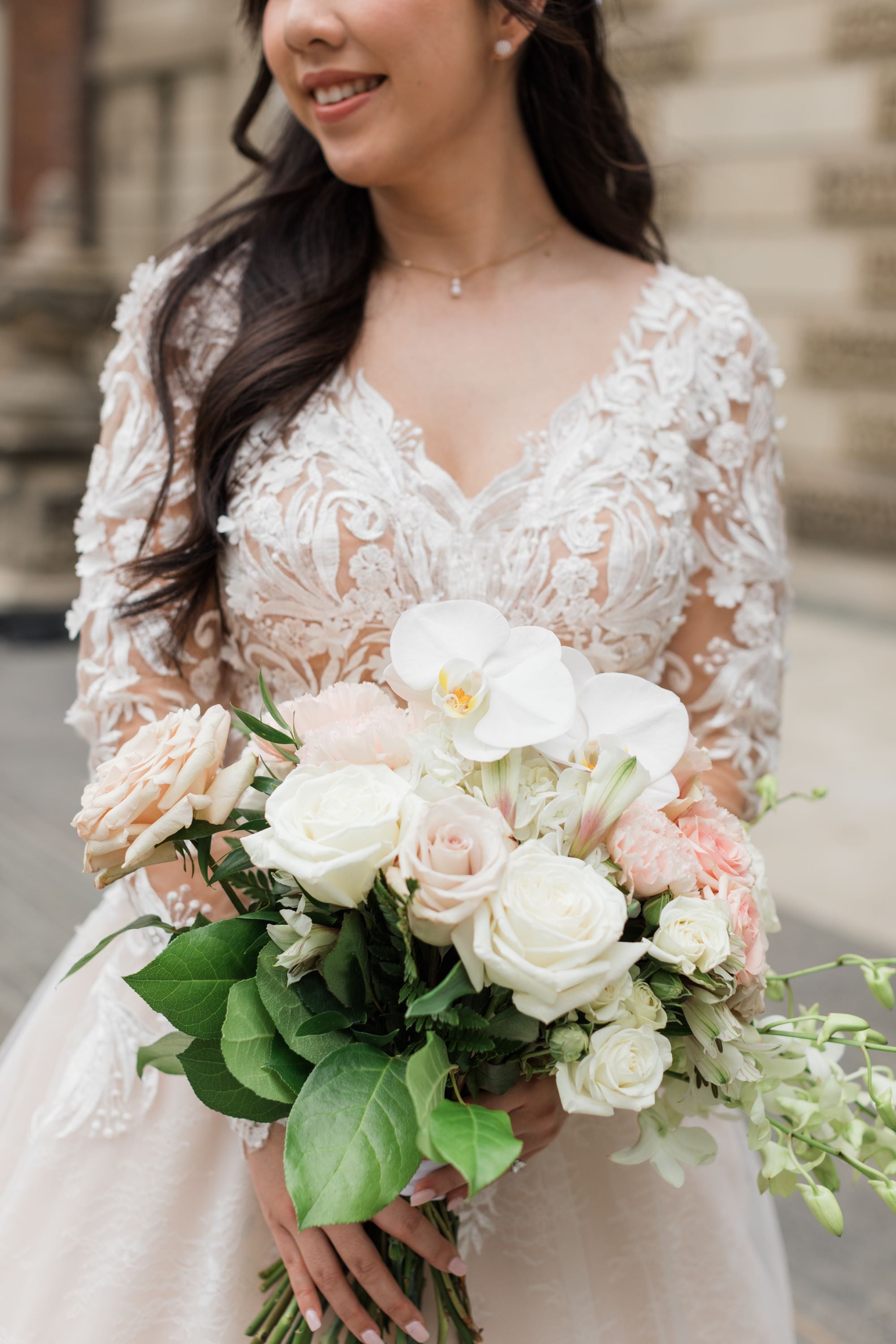 Description: For this sophisticated summer celebration, we created a romantic atmosphere using a refined palette of soft pink, light coral, and white blooms. The Museum Room's floor-to-ceiling windows and crystal chandeliers provided the perfect backdrop for our floral designs. The bridal bouquet featured a cascading arrangement of white phalaenopsis orchids, garden roses, and touches of Italian ruscus, creating an elegant yet contemporary look that complemented the bride's exquisite lace gown.