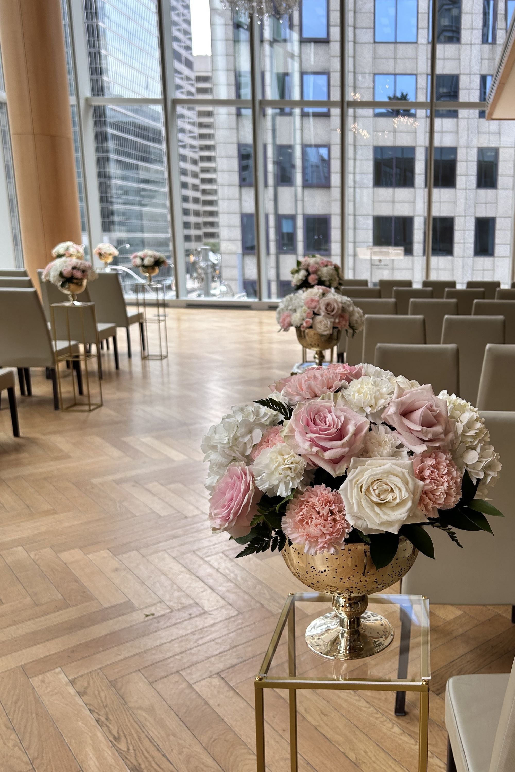 The reception space was transformed with thoughtfully designed centerpieces in gold footed vessels, each arrangement a harmonious blend of roses, hydrangeas, and carnations. The sweetheart table featured two symmetrical floral runners, each spanning 1.5 feet, creating an intimate setting for the couple while maintaining the spectacular city views.