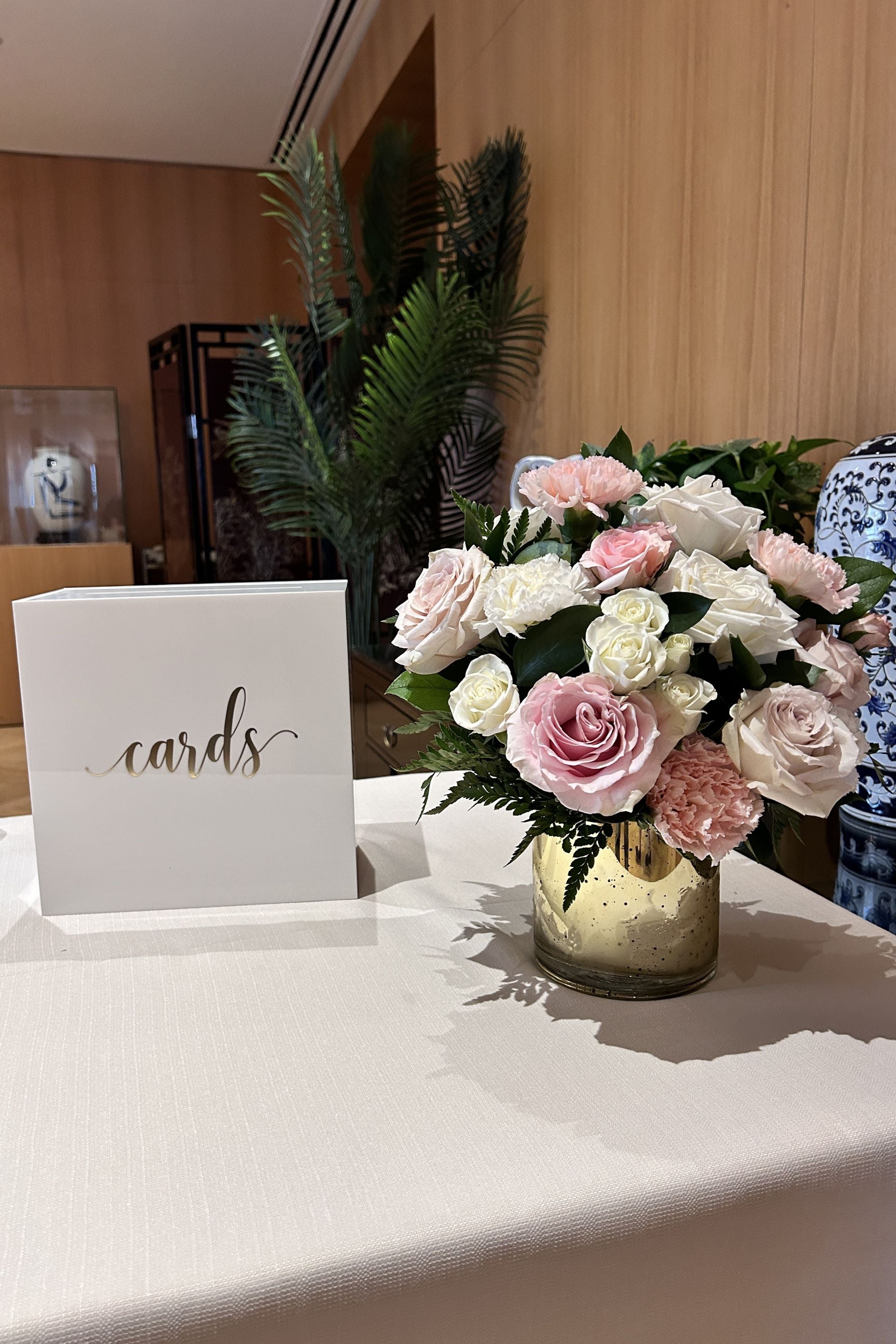 - Ten Centerpieces arranged in client-provided gold vessels, featuring a balanced mix of pink and white blooms